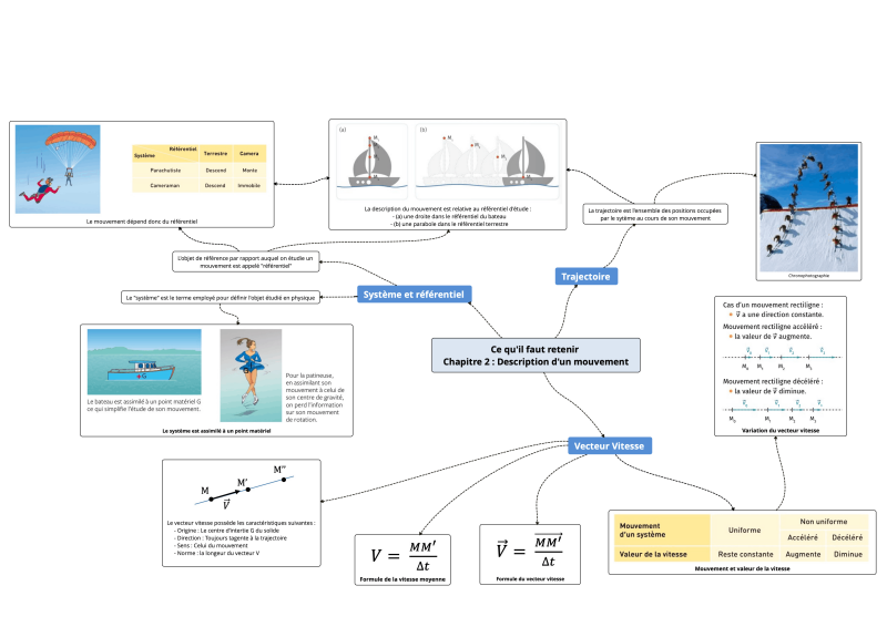 Système, échelle, référentiel, trajectoire, vecteur déplacement, vecteur vitesse moyenne et vecteur vitesse.