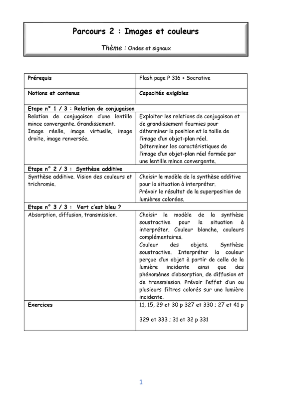 Lentille convergente, image, grandissement, relation de conjugaison, synthèse additive et soustractive, absorption, diffusion et transmission.
