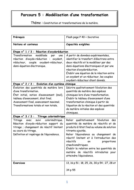Transformations, réactions d'oxydoréduction, notion d'avancement, réactions totales et non totale, mélanges stœchiométriques, titrage, équivalence.
