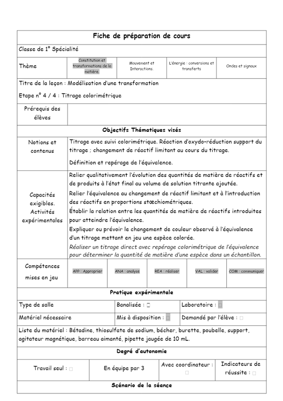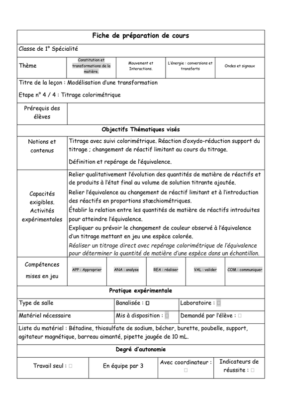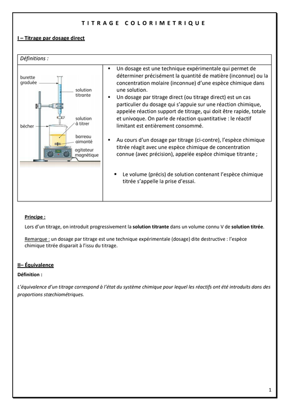 Transformations, réactions d'oxydoréduction, notion d'avancement, réactions totales et non totale, mélanges stœchiométriques, titrage, équivalence.