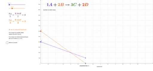 Cette animation permet de comprendre le principe d'évolution d'une réaction chimique ( de 1 à trois réactifs formant jusqu'à 3 produits) et son suivi par un tableau d'avancement.