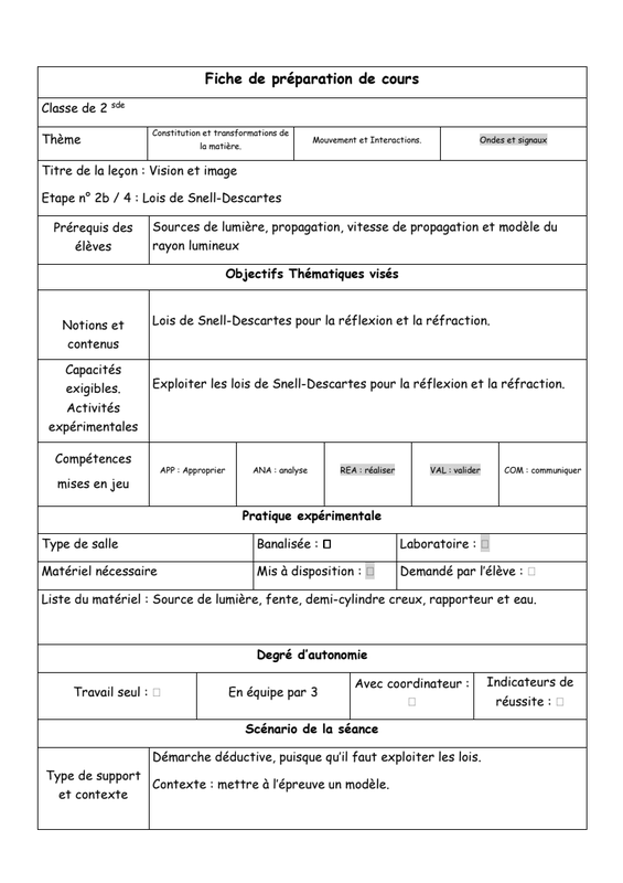 Propagation et vitesse de la lumière, lois de Snell Descartes, indice optique, lentille mince convergente, foyer, distance focale, image réelle, grandissement et œil réduit.
